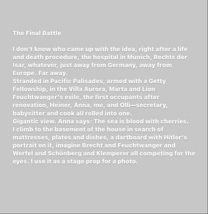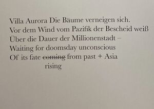 Thomas Hettche – Woraus wir gemacht sind (What we are made of), 2006 Arrival in Pacific Palisades after traveling cross country. On the shores of the Pacific Ocean, behind me the continent, everything started to turn. In the garden of Villa Aurora and the silence of the parrots, in the shade of the eucalyptus tree, I began to write. This city in my dreams forever.