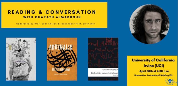 2023 Thomas Mann Fellow Ghayath Almadhoun wird seine Poesie vorlesen und kommt ins Gespräch mit Eyal Amiran (Komparative Literatur Professor bei der Universität Kaliforniern, Irvine) und Liron Mor (Komparative Literatur Assistent Professor bei der Universität Kaliforniern, Irvine).