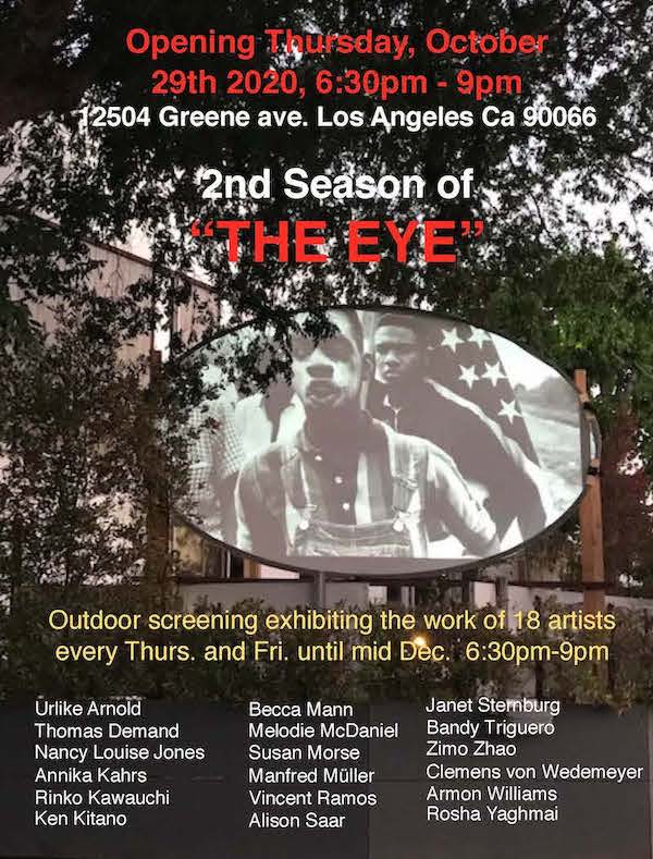 The Eye is Müller’s artistic response to the sudden closure of galleries and museums forced by the coronavirus pandemic. The first season was in July 2020. The sudden vacuum of art-centered socializing inspired Müller to collaborate with artists, family, friends and neighbors to produce an alternative space for the shared experience of art.