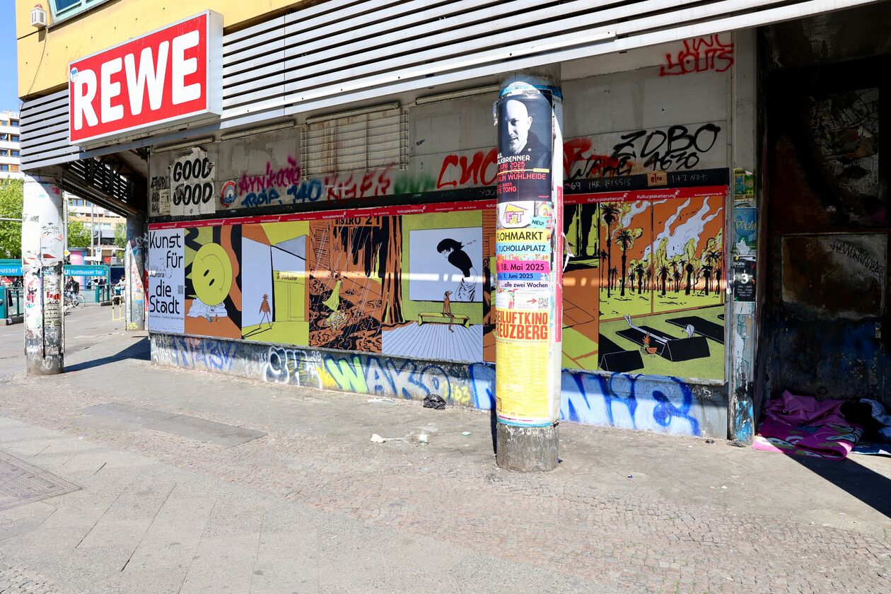 Ulu Braun’s Sunset Egonomy appears as a digital mural on Kottbusser Damm—a spiritual overload of West Coast myth, Silicon Valley twilight, and pop-media iconography. Martin Scorsese makes a cameo with ice cream; a piggy bank from a savings bank rests beneath a vision of automotive prophecy. Sunset Egonomy is both dreamscape and dissociation, promise and void.・Kottbusser Damm 1